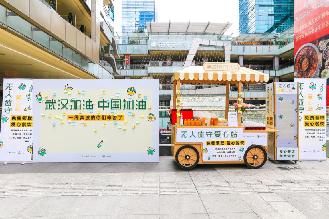 3月3日至3月8日卓悅INTOWN在街頭專設(shè)了一個(gè)”無(wú)人值守愛(ài)心站”,用愛(ài)心餐車上放滿了食物冷/熱飲,專門免費(fèi)贈(zèng)送給快遞、外賣小哥、環(huán)衛(wèi)工人、警察、城管等一線奔波的人員。