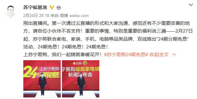 2月24日晚,蘇寧易購召開線上發(fā)布會,宣布27日起,將聯合家電、家裝、3C等品類品牌,全場景推出“購家電家裝手機,享24期分期免息”活動,讓消費者零負擔擁有喜歡的好物。
