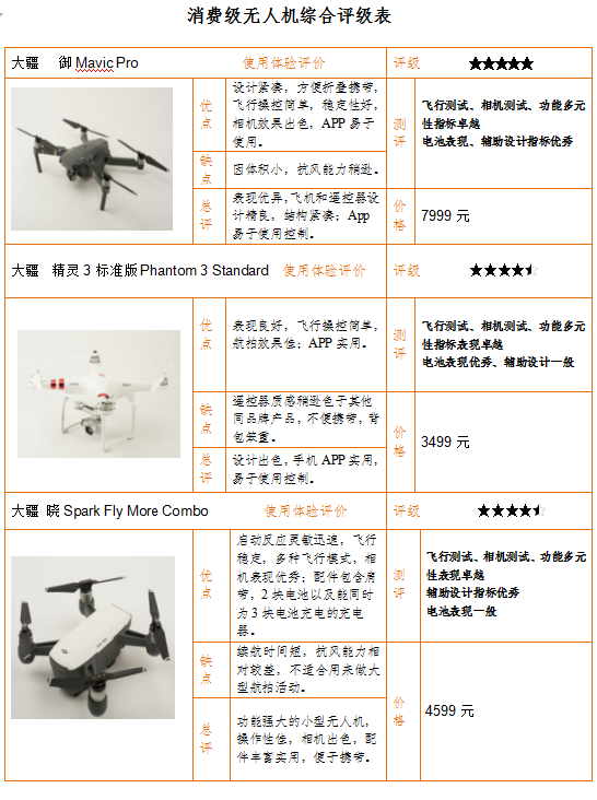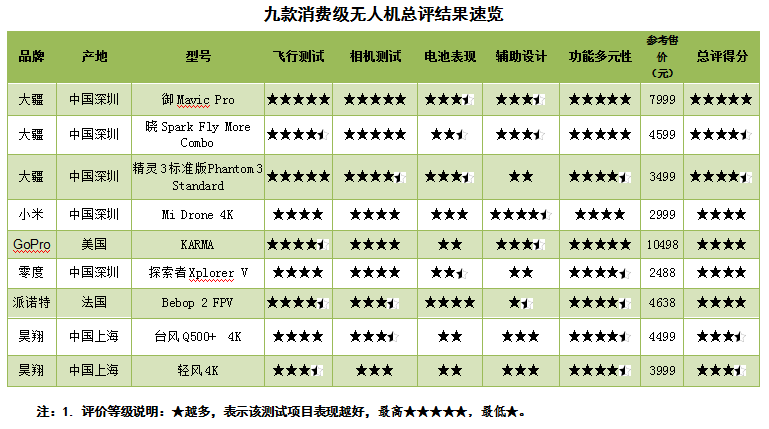 其中大疆的“御Mavic Pro”和“曉Spark Fly More Combo”表現(xiàn)出眾,獲得5分滿(mǎn)分。