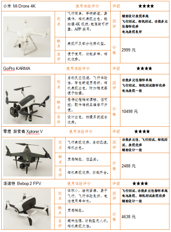 總評(píng):小米“Mi Drone 4K”輔助設(shè)計(jì)表現(xiàn)最好,獲評(píng)4.5分。派諾特“Bebop 2 FPV”和零度“探索者Xplorer V”表現(xiàn)較差,僅獲評(píng)1.3分和1.8分。詳見(jiàn)下表。