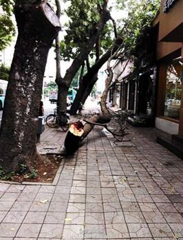 然而行道樹的不當(dāng)種植與生長也會(huì)帶來許多危害。行道樹傾斜生長極易造成樹木倒伏,倒伏后造成倒壓占道的同時(shí)也存在巨大的安全隱患。且行道樹龐大的樹根也會(huì)存在破壞人行道及盲道的現(xiàn)象,造成路面不平,部分傾倒的樹木還易引發(fā)斷電和漏電等問題,給市民生活帶來不便。