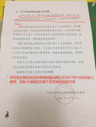 據(jù)悉,該市民在2017年已在信訪局上針對低層油煙管道對居民區(qū)排放油煙的問題進(jìn)行投訴,當(dāng)年12月1日得到了深圳市羅湖區(qū)環(huán)境保護(hù)與水務(wù)局的回復(fù),稱羅湖區(qū)環(huán)水局已于2017年1月對相關(guān)低空排放油煙的餐廳提出了要將油煙高空排放的要求,餐廳安裝的高空煙管也已于2017年10月正式投入使用。