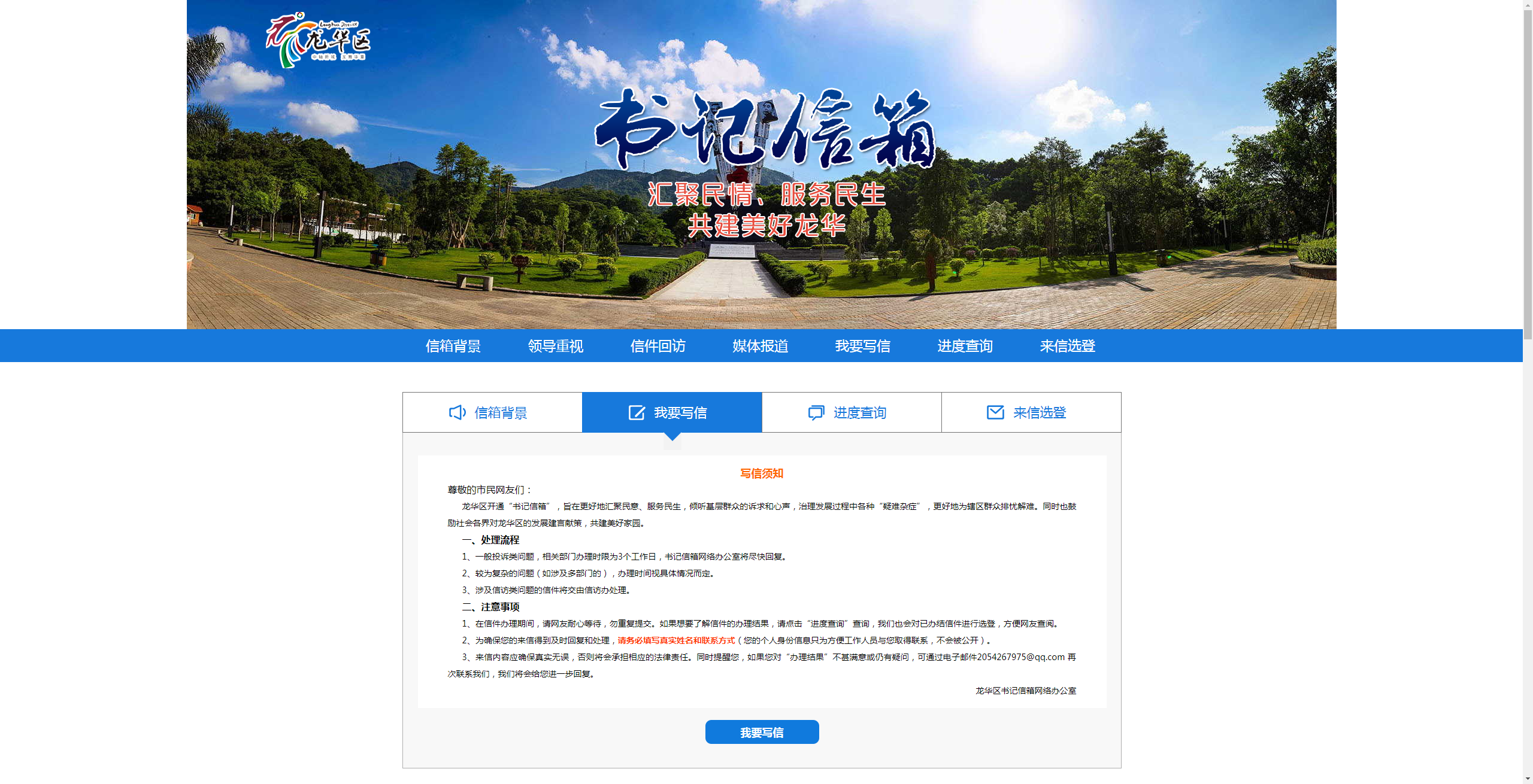 龍華區(qū)“書記信箱”網(wǎng)絡(luò)平臺(tái)是由龍華區(qū)領(lǐng)導(dǎo)的指導(dǎo)下搭建的網(wǎng)絡(luò)信息平臺(tái),由深圳新聞網(wǎng)團(tuán)隊(duì)進(jìn)行開發(fā)搭建。“書記信箱”的構(gòu)建,是龍華區(qū)委貫徹落實(shí)黨的群眾路線,踐行“三嚴(yán)三實(shí)”的一項(xiàng)新舉措。“書記信箱”自2015年10月31日正式上線以來,逐步成為龍華市民向龍華區(qū)委反映、提出建議、意見和投訴請(qǐng)求的重要渠道。