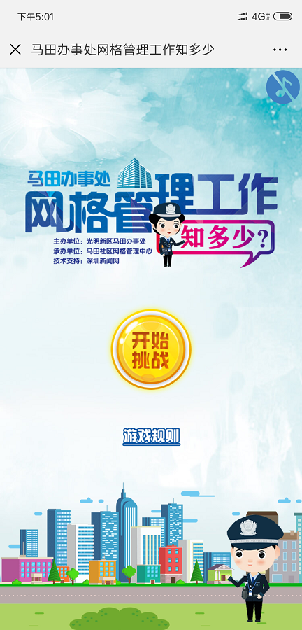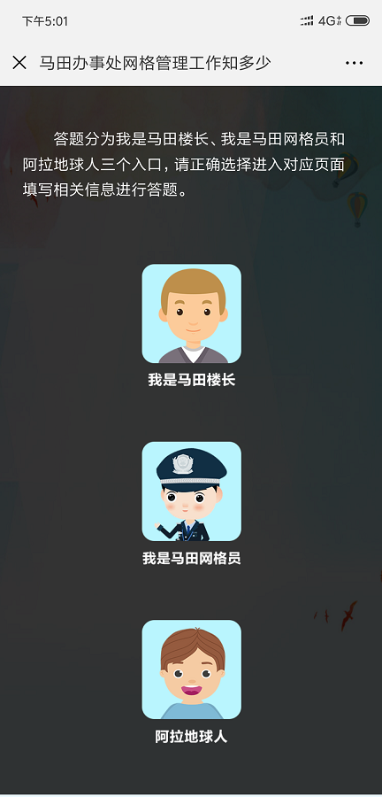 隨著當(dāng)前光明新區(qū)經(jīng)濟(jì)和社會的飛速發(fā)展,網(wǎng)格巡查管理工作環(huán)境日趨復(fù)雜。為此,馬田辦事處以社區(qū)網(wǎng)格化為抓手,積極帶領(lǐng)業(yè)主、樓長、住戶主動參與到樓棟的管理和社區(qū)的建設(shè),使他們從小“家”邁向大“家”,家家參與、人人行動,讓安全文明新風(fēng)形成常態(tài),營造生機(jī)勃勃、欣欣向榮的社會氛圍,在馬田轄區(qū)打造共建共治共享社會治理格局。“馬田辦事處網(wǎng)格管理工作知多少”線上有獎競答活動,由光明新區(qū)馬田辦事處主辦,馬田社區(qū)網(wǎng)格管理中心承辦。此次答題活動自8月15日9點(diǎn)啟動,截止至8月19日23點(diǎn)59分,為期5天。答題分為“我是網(wǎng)格員”入口、“我是樓長”入口和“阿拉地球人”三個入口。通過樓長入口進(jìn)入的用戶,需輸入馬田轄區(qū)樓長身份證或港澳通行證號方可答題,網(wǎng)格員入口則需輸入馬田轄區(qū)網(wǎng)格員有效證件號碼進(jìn)入對應(yīng)的答題頁面。在每次答題時,答題系統(tǒng)將隨機(jī)抽取10道題,用戶須在120秒的時間內(nèi)完成,答對8題以上即視為闖關(guān)成功,可獲得一次抽獎機(jī)會,有機(jī)會獲得100元、50元、10元、5元、2元不等的微信紅包。