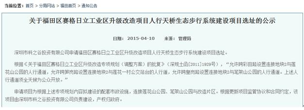 而據(jù)資料記載,市規(guī)土委曾經(jīng)在2015年4月10日,在福田管理局官網(wǎng)上發(fā)布了《關(guān)于福田區(qū)賽格日立工業(yè)區(qū)升級(jí)改造項(xiàng)目人行天橋生態(tài)步行系統(tǒng)建設(shè)項(xiàng)目選址的公示》,其中明確提到“根據(jù)《關(guān)于福田區(qū)賽格日立工業(yè)區(qū)升級(jí)改造專項(xiàng)規(guī)劃(調(diào)整方案)的批復(fù)》(深規(guī)土函[2011]1929號(hào)),‘允許跨彩田路設(shè)置連接地塊2與蓮花山公園的人行通道,允許跨筍崗路設(shè)置連接地塊2與蓮花一村公交站臺(tái)的人行道,允許跨皇崗路設(shè)置連接地塊2與筆架山公園的人行通道。上述人行通道須全天候?yàn)楣婇_放’?!?/p>