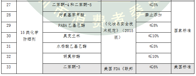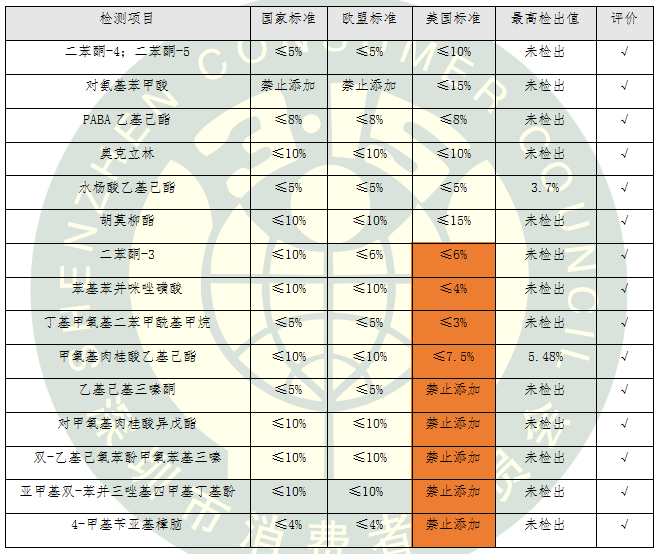 防曬化妝品在美國按非處方藥(OTC)管理,新的防曬劑當作新藥品來批準,審評要求非常嚴格。本次比較試驗測試的15類化學(xué)防曬劑按照國標、歐標和美標中最嚴格的標準進行評價。我國允許使用的5類化學(xué)防曬劑在美國被禁止使用,還有4類化學(xué)防曬劑在美國的限量要求更加嚴格。