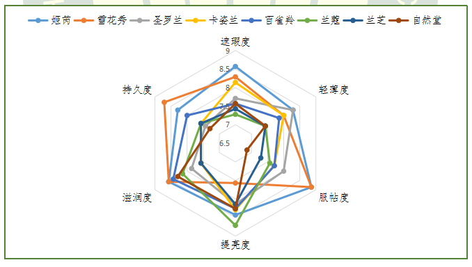 獲得本次感官評價指標綜合得分前三名的品牌為:姬芮、雪花秀和圣羅蘭,得分分別為:8.44、8.22和7.91。8款產(chǎn)品在感官評價中均達到優(yōu)良水平以上。