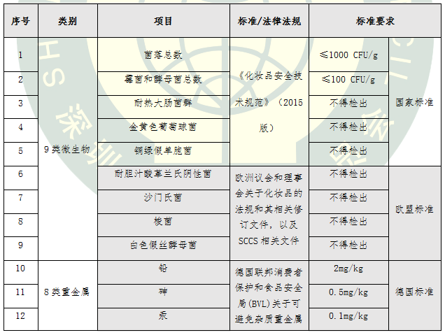 本次比較試驗檢測項目廣泛征求了企業(yè)、業(yè)內(nèi)專家和第三方檢測機構(gòu)的意見,不僅依據(jù)了現(xiàn)行國家標準,而且在國標基礎(chǔ)上結(jié)合嚴格的歐盟標準 《歐盟化妝品法規(guī)EC1223/2009及其相關(guān)修訂文件》、《歐盟消費者安全科學(xué)委員會(SCCS)關(guān)于化妝品安全的第九版指南》、德國聯(lián)邦消費者保護和食品安全局(BVL)關(guān)于可避免雜質(zhì)重金屬限值的調(diào)查報告、美國《聯(lián)邦食品、藥品和化妝品法案》、日本厚生勞動省《藥事法》以及其它相關(guān)標準、法規(guī)和技術(shù)文件的要求,采用國家標準檢測方法、實驗室通用方法等手段進行檢測,從44項指標展開氣墊粉底安全性品質(zhì)大比拼,詳細項目與要求見表1。