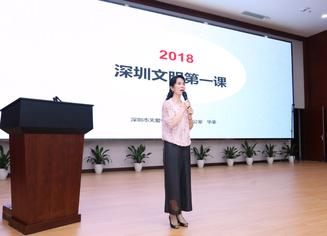 深圳市關愛辦副主任華榮以詳實的數據和感人的視頻講述文明第一課