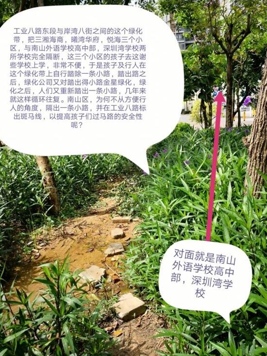 同時(shí),該市民還反映在工業(yè)八路東段與岸灣八街之間存在三個(gè)小區(qū)和兩個(gè)學(xué)校,周邊居民和孩子為了圖方便,在綠化帶上自行踏出了一條小路,綠化公司有對(duì)小路進(jìn)行綠化處理,但是處理過(guò)后,居民和孩子又會(huì)重新踏出一條,幾年來(lái)就這樣循環(huán)往復(fù)。并呼吁相關(guān)部門(mén)在此綠化帶修一條小路,在工業(yè)八路標(biāo)出斑馬線,提高孩子過(guò)馬路的安全性。