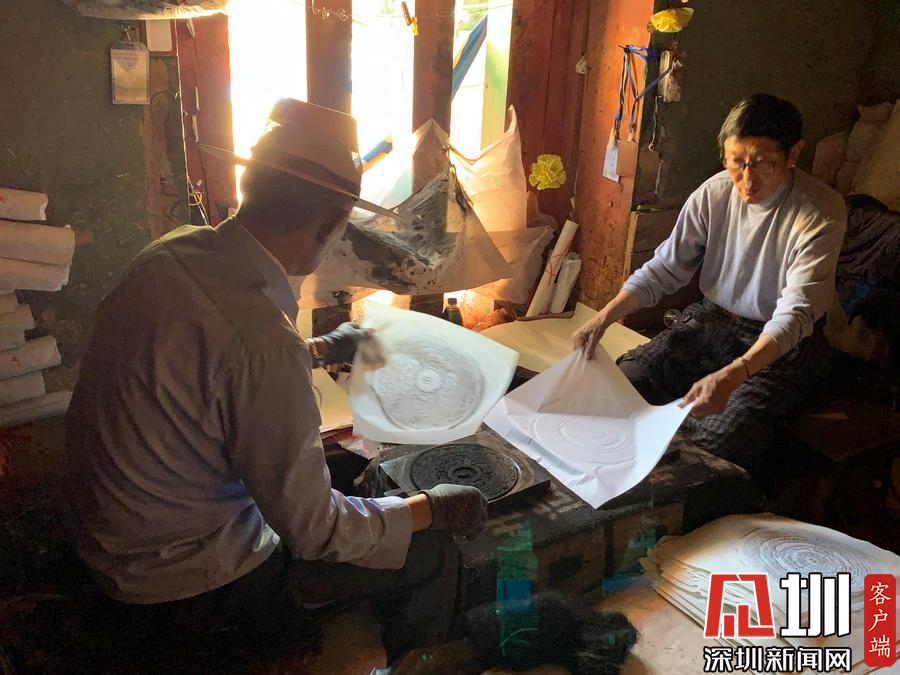 高坐的人負(fù)責(zé)接紙并準(zhǔn)確固定印版與印紙之間的一拓面,以及在印版上滾墨,矮坐的人則一邊遞紙,一邊持卷布干滾筒,自上而下雙手推過,迅速揚(yáng)起已印的書頁放置一旁,如此周而復(fù)始。李仁奇攝