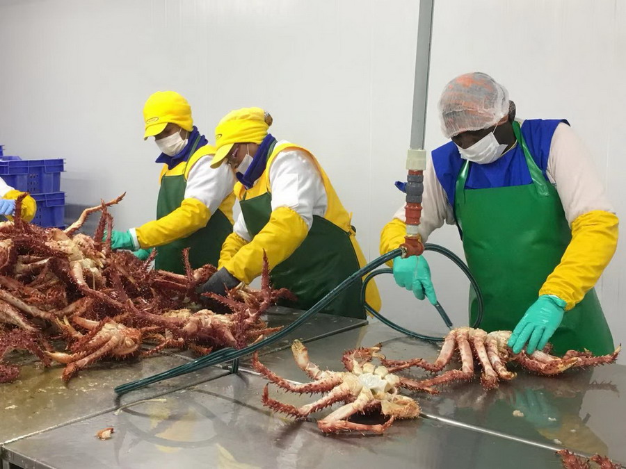 網(wǎng)友在蜘蛛蟹加工基地。湯有國攝