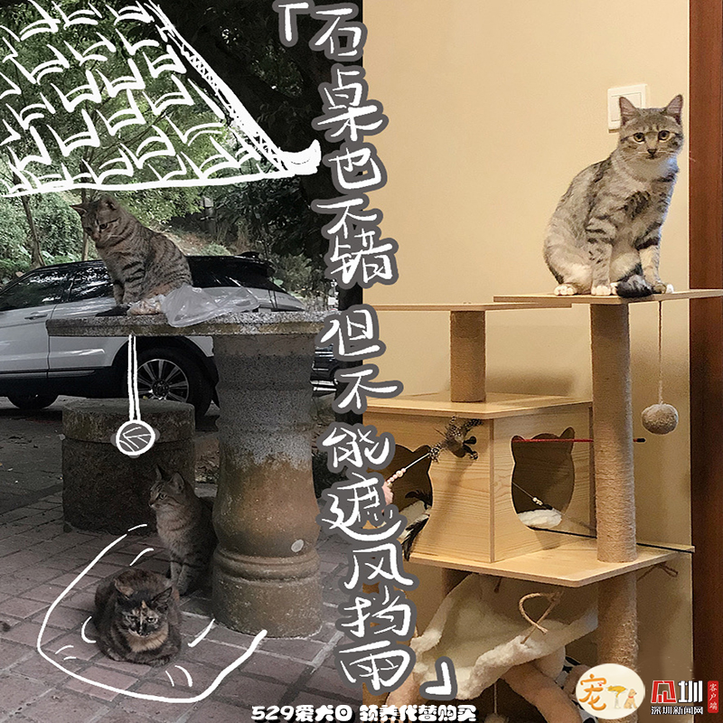 外面的世界再精彩,也比不過一個能遮風(fēng)擋雨,沒有車流、毒藥威脅,三餐穩(wěn)定、四季如春的容身之處,更何況,這里還有比石桌更有趣的貓爬架和比落葉更好玩的小玩具。現(xiàn)在“高高在上”“作威作?!钡呢堖洌彩腔ü饬艘簧羞\氣,才能在無法獨自生存的小時候,遇見一個愿意照顧TA一生的“兩腳獸”。