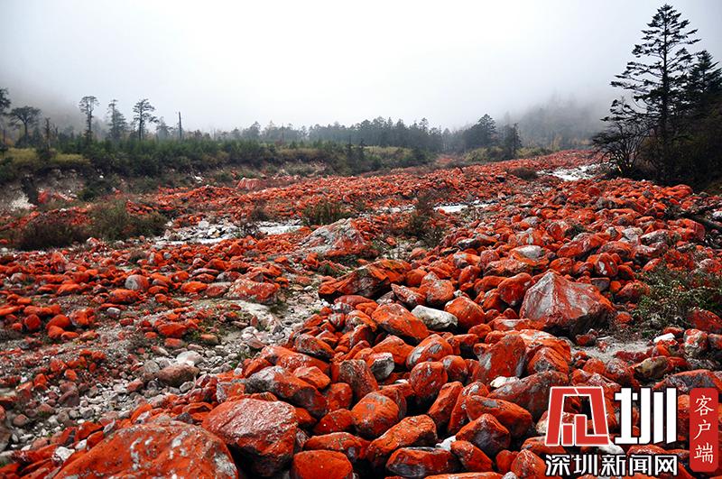 紅石對生長環(huán)境的要求極為苛刻,空氣潔凈度、濕度、水的清潔度都會影響它們的生長。雅家梗一代低碳富氧的空氣、冰山融雪的溪流、森林茂密的植被,為紅石的生長繁衍提供了最理想的環(huán)境。在這里,紅石密布于近百米寬的河谷里,不同的季節(jié),不同的天氣狀況下,幻化出不同的色彩,呈現(xiàn)朝紅夕褚的奇異景觀。