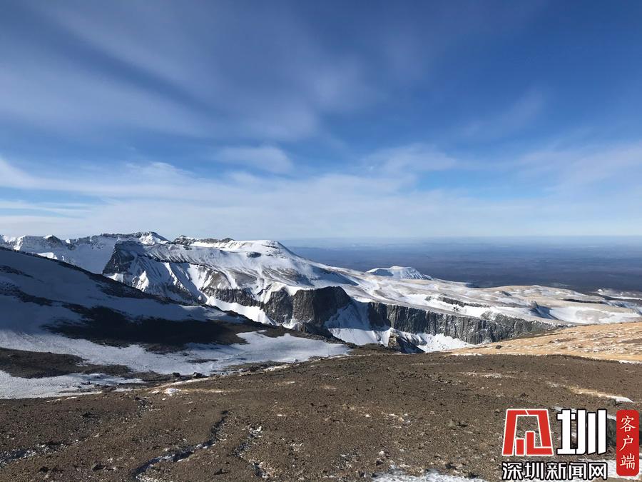 山上積雪覆蓋,與天邊的景色相互交映成一幅美麗的風(fēng)景畫。