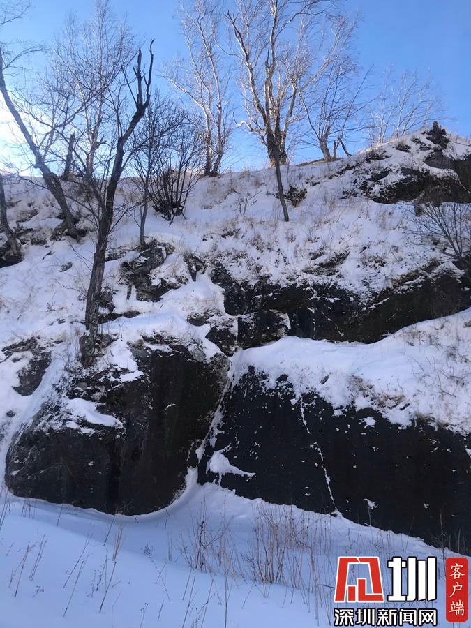 積雪厚厚的落了一層,覆蓋在黑色巖石上。