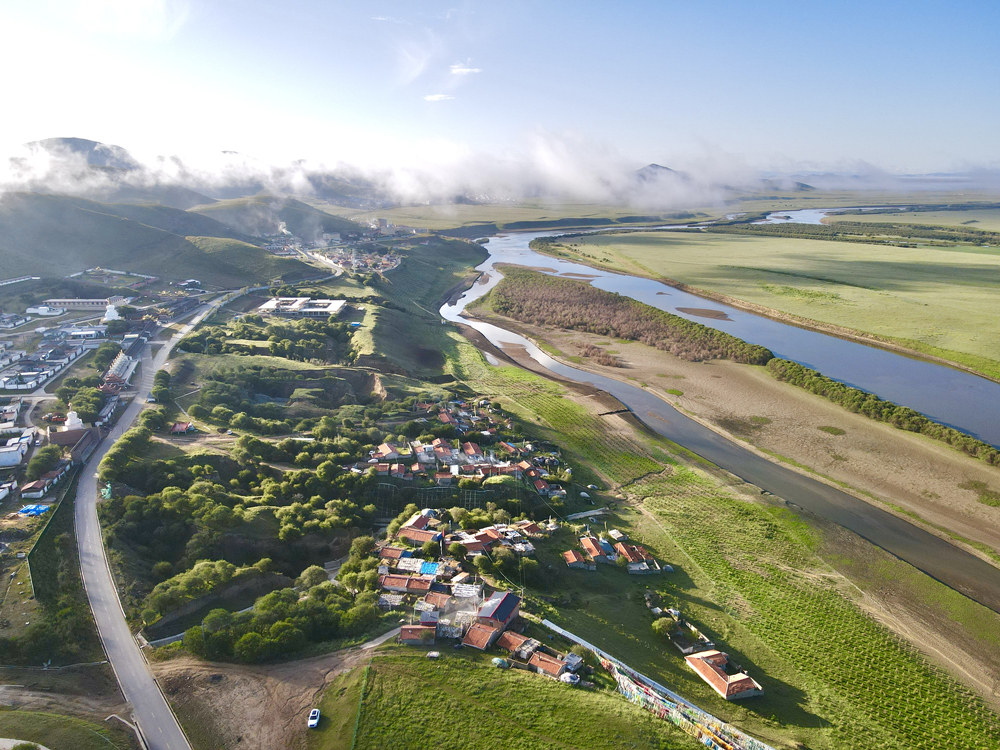 往白河方向遠(yuǎn)眺,群山煙霧繚繞,如夢(mèng)似幻;山下索克藏寺,沐浴晨光。航拍圖,郭國(guó)政 攝