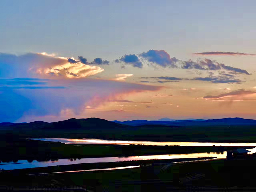 日落時分,空中的云不再是白色的,而是像披上了一件橘紅色的衣衫,漂浮在空中,平靜柔美的河水也鍍上了一層金黃色的光暈?!熬徘S河第一灣”,果然名不虛傳。李仁奇 攝