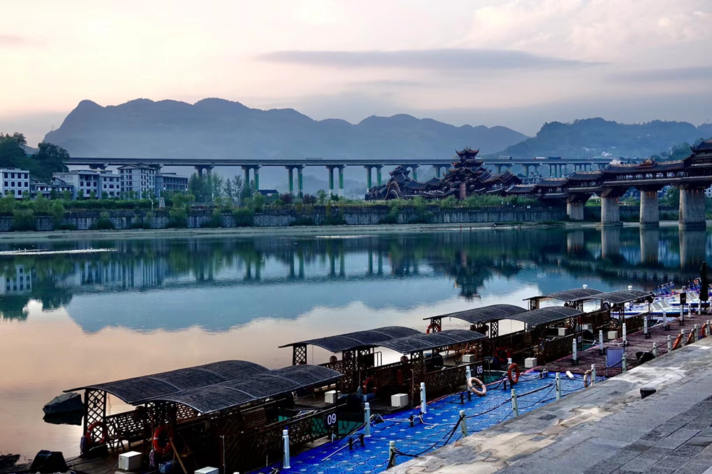 橫跨于濯水古鎮(zhèn)阿蓬江上的超長(zhǎng)廊橋有“世界第一風(fēng)雨廊橋”之稱。李仁奇 攝