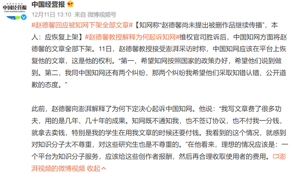 12月10日,中國知網(wǎng)向趙德鑫教授道歉,表示將妥當(dāng)處理趙德鑫教授作品繼續(xù)在知網(wǎng)平臺傳播的問題。道歉中提到,2016年起,中國知網(wǎng)向全社會免費開放八年前出版的文獻,未來將進一步免費開放更多的學(xué)術(shù)資源。2019年起,所有在中國知網(wǎng)實名注冊的作者,可無限期免費使用自己的作品,管理自己的學(xué)術(shù)成果,并隨時跟蹤其研究成果的學(xué)術(shù)影響。