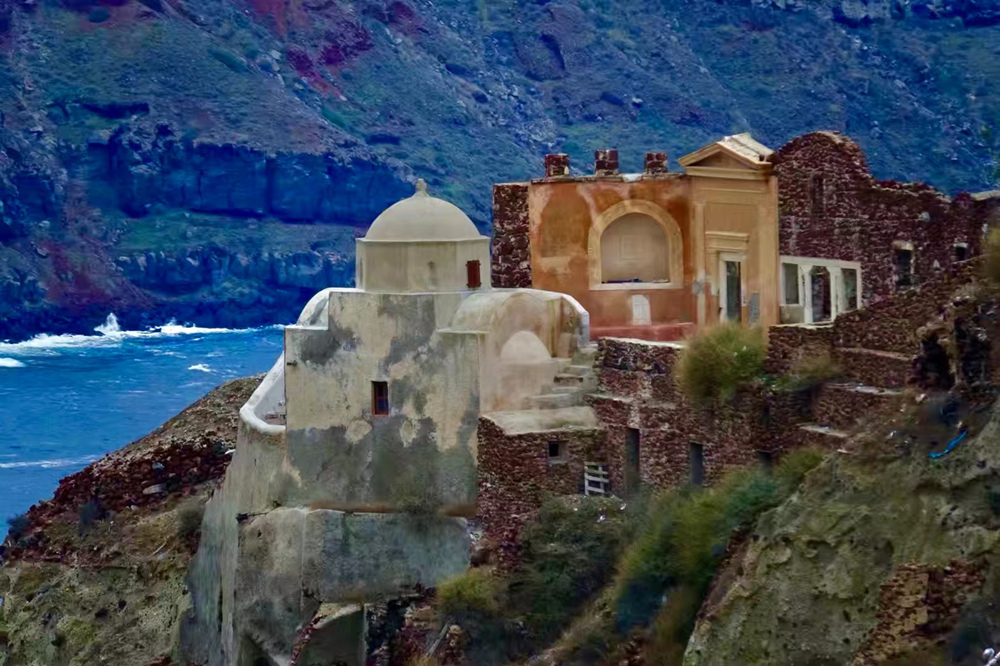 費(fèi)拉碼頭附近有許多懸崖,無數(shù)的白色小屋依山而建,與天空、海洋混成一體,這是地中海獨(dú)有的景觀。李仁奇 攝