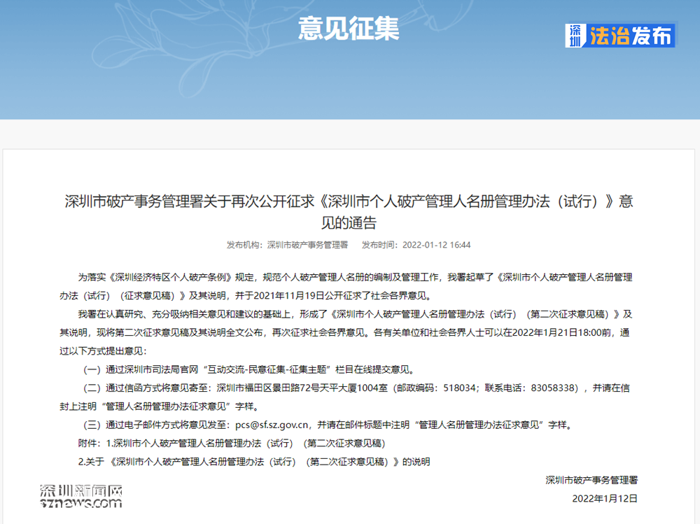在認真研究、充分吸納相關意見和建議的基礎上,深圳市破產事務管理署形成了《深圳市個人破產管理人名冊管理辦法(試行)(第二次征求意見稿)》及其說明,已將第二次征求意見稿及其說明全文在深圳市司法局官網公布,各有關單位和社會各界人士可以在2022年1月21日18:00前,通過以下方式提出意見: