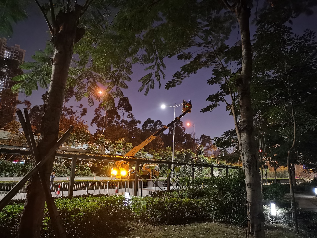 身穿深圳照明馬甲的工作人員正在對(duì)路燈進(jìn)行維修更換(11月25日攝)