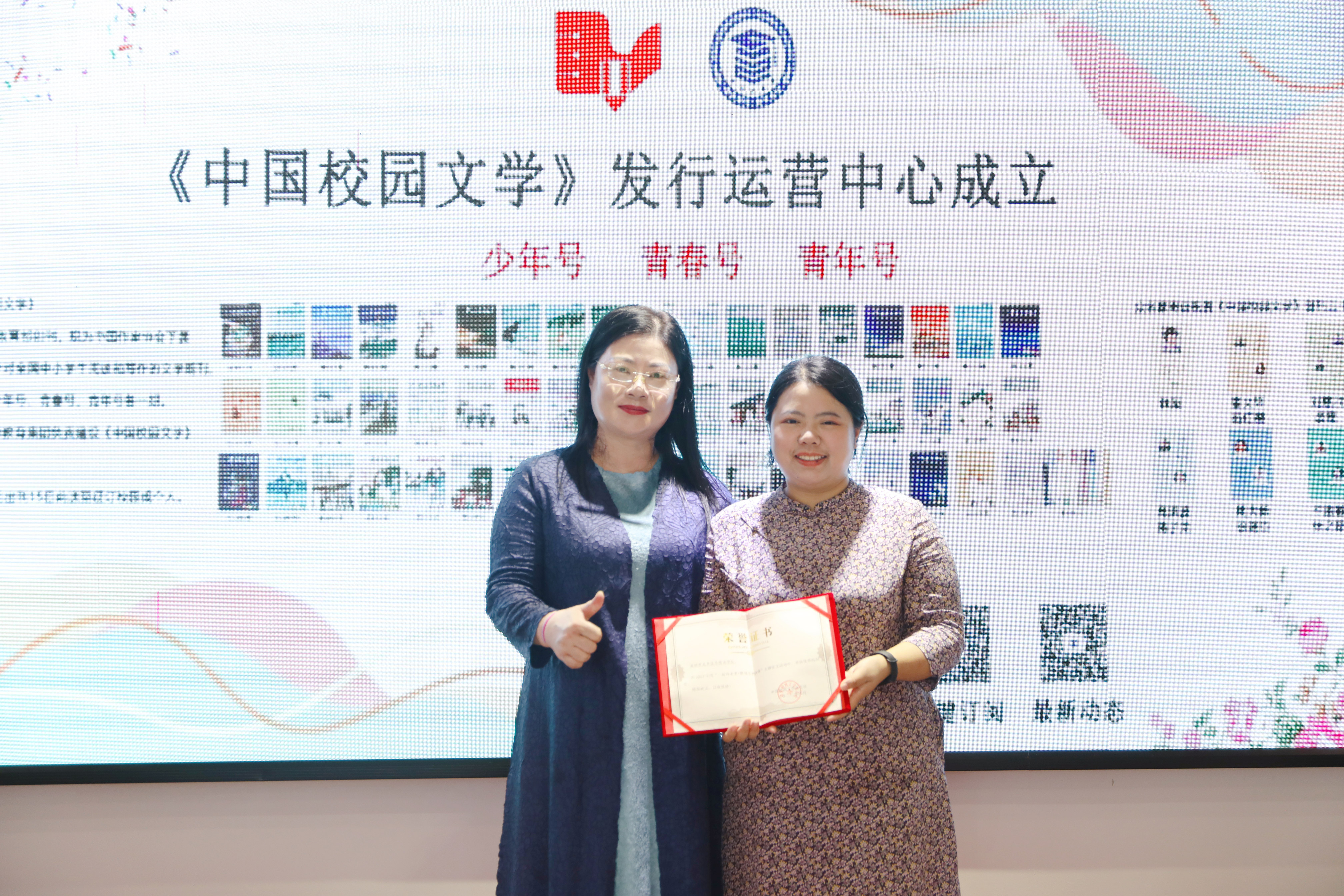 全國文學(xué)盛典聯(lián)合發(fā)起人、創(chuàng)始人肖硯寧為獲獎教師代表頒獎并合影