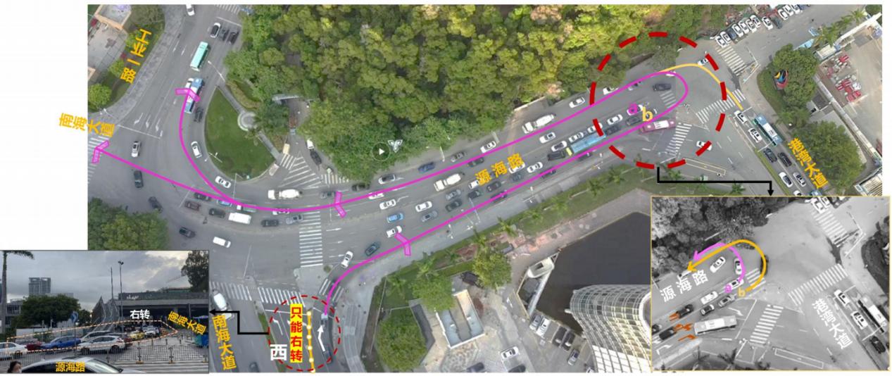 南山區(qū)南海大道時(shí)間廣場(chǎng)路段是通往蛇口、前海的重要道路,早晚高峰期車流量較大。修地鐵時(shí)在南海大道做了“布袋口臨時(shí)設(shè)施”,南海大道現(xiàn)已經(jīng)恢復(fù)通車,但因臨時(shí)設(shè)施還未及時(shí)拆掉,路口紅綠燈沒有啟用。加之車道收窄,原本可以快速左轉(zhuǎn)北行的車流被擠成一條右轉(zhuǎn)車道,再擠到老碼頭掉頭,四車道變一車道,導(dǎo)致高峰期多數(shù)車輛爭(zhēng)搶道,既不安全還加劇了擁堵。