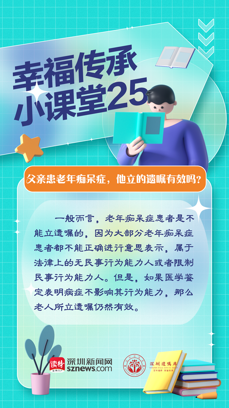 讀特客戶端·深圳新聞網(wǎng)2023年2月8日訊(記者 翁任瑩 張玲)李女士照顧患了老年癡呆癥的父親六年,父親去世后,李女士三個哥哥要求與妹妹平分父親的遺產(chǎn)。女兒拿出了一份父親的遺囑,哥哥們卻認為這份遺囑無效。由廣東嘉得信律師事務(wù)所和深圳新聞網(wǎng)聯(lián)合開設(shè)的“幸福傳承小課堂”開講第25期,我們來聊聊上述情形的遺囑效力。