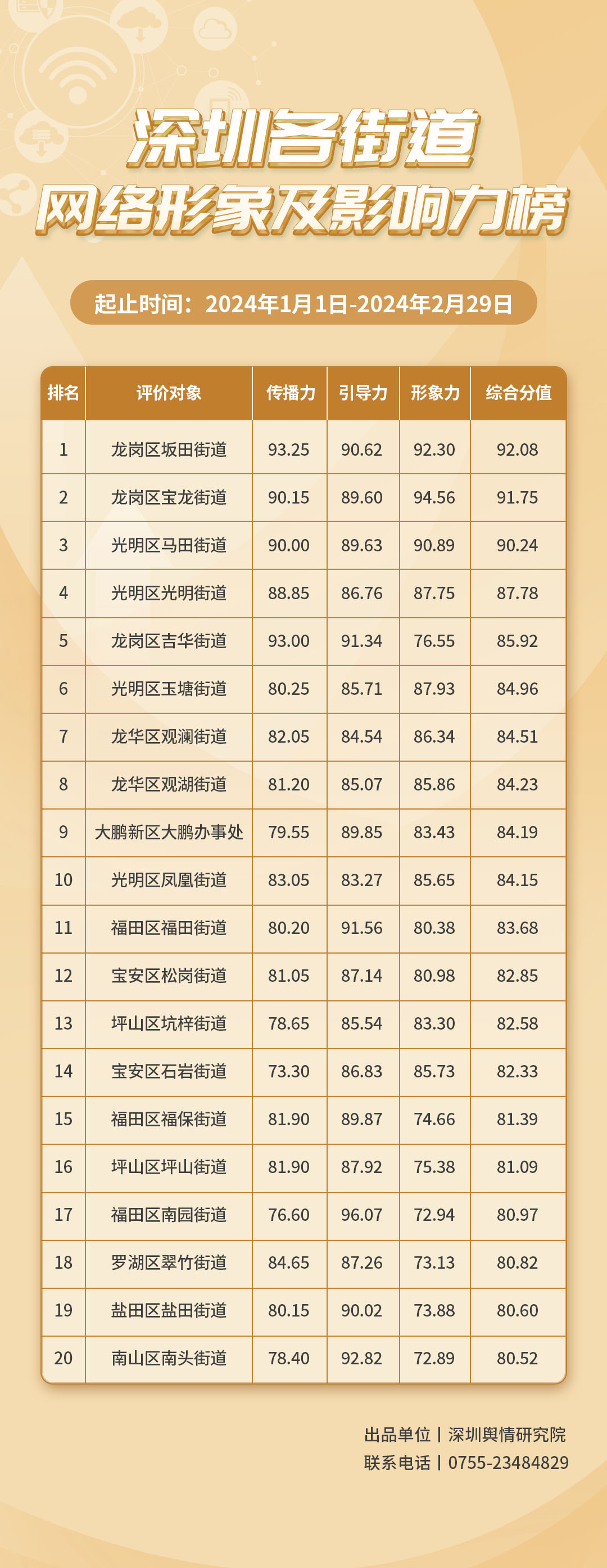 深圳新聞網(wǎng)3月21日訊(記者 王亞男 實(shí)習(xí)生 上官新昕) 2024年3月20日,深圳輿情研究院編制推出《深圳各街道網(wǎng)絡(luò)形象及影響力榜》(1-2月期),公布深圳市20個(gè)網(wǎng)絡(luò)形象及影響力建設(shè)成效靠前的街道,并指出深入了解各街道的網(wǎng)絡(luò)形象構(gòu)建狀況和社會(huì)影響,有助于推動(dòng)街道治理“提質(zhì)增效”,增加城市高質(zhì)量發(fā)展動(dòng)能。