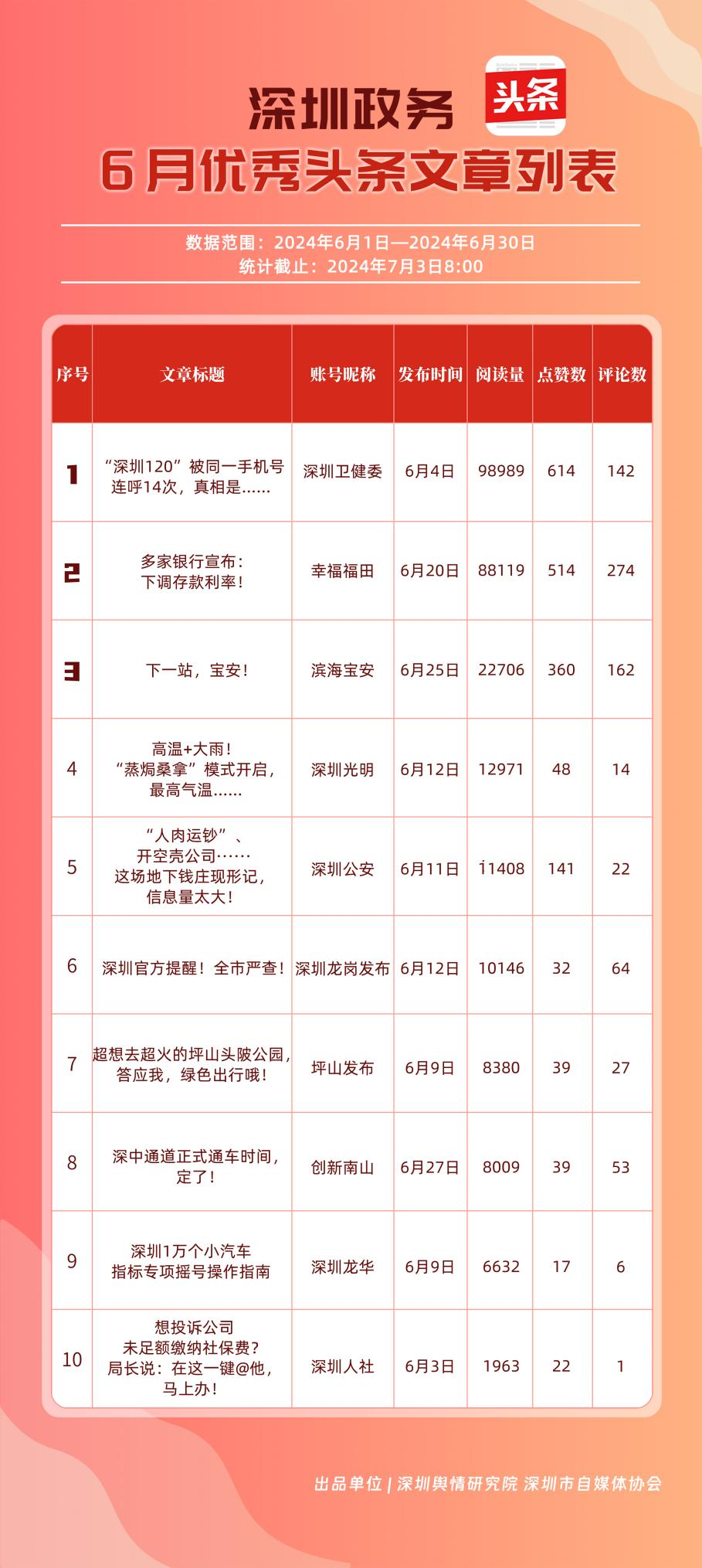 6月,“幸福福田”“深圳龍崗發(fā)布”“深圳衛(wèi)健委”“深圳光明”“濱海寶安”“深圳龍華”“創(chuàng)新南山”“坪山發(fā)布”“深圳公安”“深圳人社”共10個(gè)政務(wù)頭條號(hào)能夠及時(shí)發(fā)布政務(wù)信息及公共服務(wù)信息,入列“優(yōu)秀政務(wù)頭條號(hào)”榜單。從數(shù)據(jù)上分析,《“深圳120”被同一手機(jī)號(hào)連呼14次,真相是……》《多家銀行宣布:下調(diào)存款利率!》《下一站,寶安!》等優(yōu)秀文章為網(wǎng)民提供醫(yī)療急救、經(jīng)濟(jì)政策、區(qū)域發(fā)展等領(lǐng)域的信息,發(fā)揮各自賬號(hào)在信息傳播、公共服務(wù)等方面的重要功能,收獲較高點(diǎn)贊。