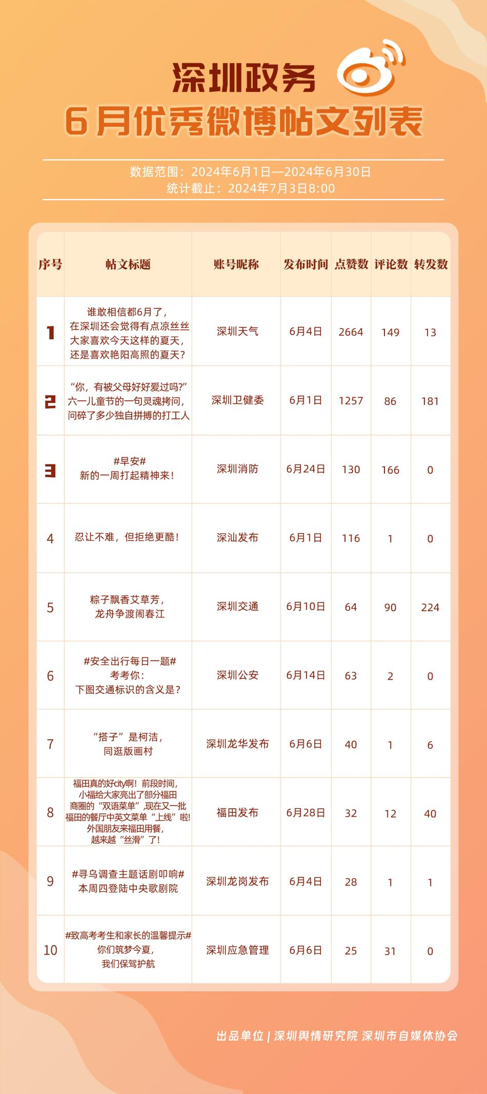 6月,“深圳天氣”“深圳衛(wèi)健委”“深圳消防”“福田發(fā)布”“深圳公安”“深圳應(yīng)急管理”“深圳交通”“深圳市城市管理和綜合執(zhí)法局”“深圳交警”“深圳龍崗發(fā)布”等20個(gè)政務(wù)微博號(hào)入列“優(yōu)秀”名單?!吧钲谔鞖狻薄吧钲谛l(wèi)健委”“深圳消防”等賬號(hào)抓住微博平臺(tái)的傳播特征,持續(xù)輸出優(yōu)質(zhì)內(nèi)容,滿足受眾需求,不斷提高用戶體驗(yàn)和傳播效果。