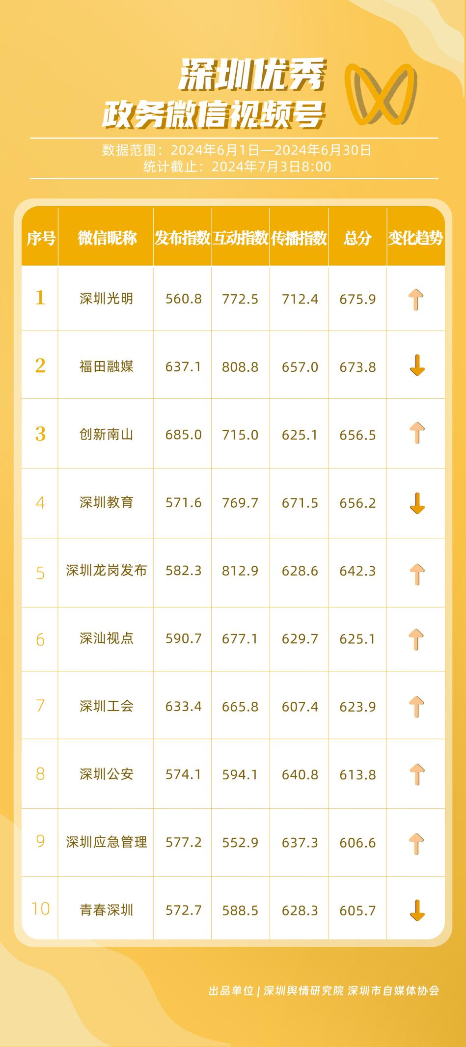 6月,“深圳衛(wèi)健委”“i深圳”“深圳龍崗發(fā)布”“幸福福田”“深圳交通”“深圳教育”“濱海寶安”“創(chuàng)新南山”“深圳工會(huì)”“青春深圳”“同心鵬城”“深圳光明”等30個(gè)政務(wù)微信公眾號(hào),被評(píng)為“深圳優(yōu)秀政務(wù)微信公眾號(hào)”。6月,“深圳衛(wèi)健委”因內(nèi)容策劃出色、受眾互動(dòng)活躍、作品火熱“出圈”等,榮登排行榜首位?!皠?chuàng)新南山”“同心鵬城”“深圳社保”“深圳教育”等上榜公眾號(hào)也積極創(chuàng)作優(yōu)質(zhì)作品,抓住時(shí)下熱點(diǎn)趨勢(shì),集中發(fā)揮政務(wù)媒體傳播力量,推動(dòng)了政務(wù)信息傳播工作提質(zhì)增效。