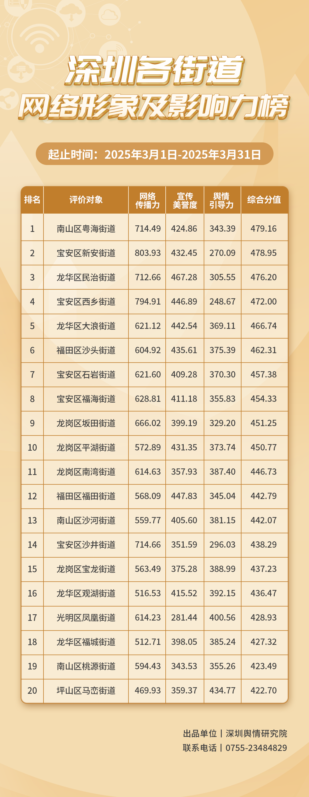 2025年3月,共有20個街道登上《深圳各街道網(wǎng)絡(luò)形象及影響力榜》,分別是:南山區(qū)粵海街道、寶安區(qū)新安街道、龍華區(qū)民治街道、寶安區(qū)西鄉(xiāng)街道、龍華區(qū)大浪街道、福田區(qū)沙頭街道、寶安區(qū)石巖街道、寶安區(qū)福海街道、龍崗區(qū)坂田街道、龍崗區(qū)平湖街道、龍崗區(qū)南灣街道、福田區(qū)福田街道、南山區(qū)沙河街道、寶安區(qū)沙井街道、龍崗區(qū)寶龍街道、龍華區(qū)觀湖街道、光明區(qū)鳳凰街道、龍華區(qū)福城街道、南山區(qū)桃源街道、坪山區(qū)馬巒街道。