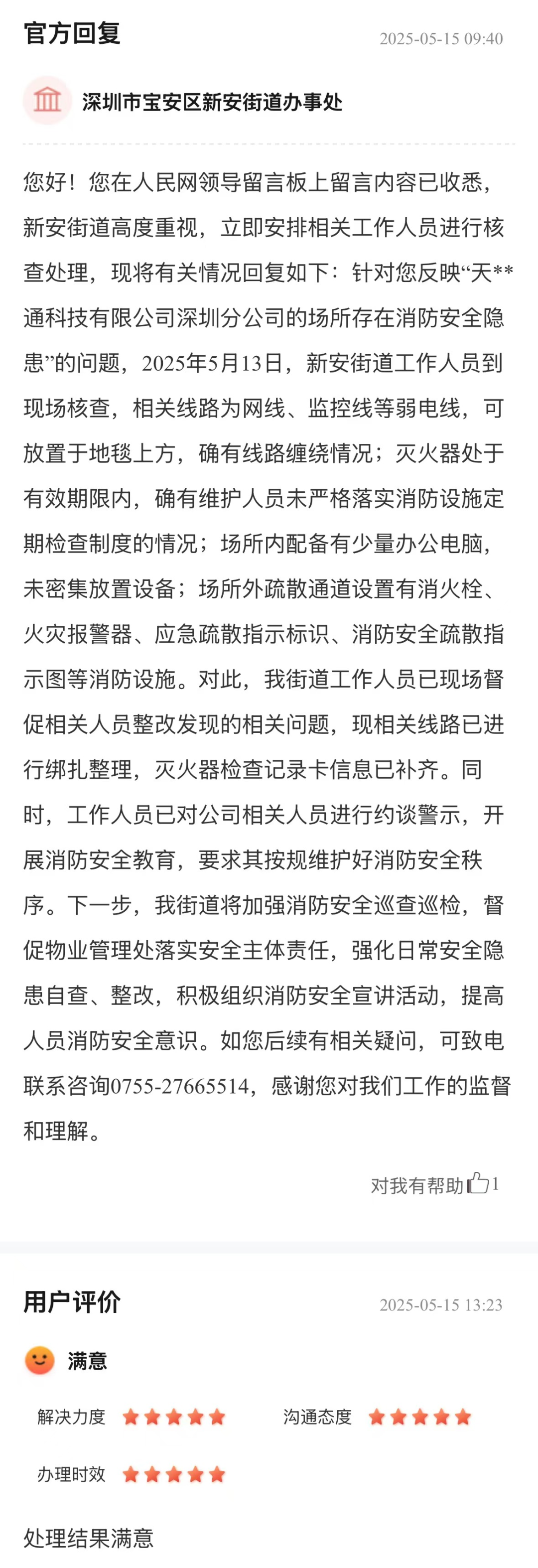 企業(yè)電氣線路混亂、滅火器維護(hù)缺位等消防隱患,直接威脅員工生命財產(chǎn)安全,更潛藏重大事故風(fēng)險。街道辦收到市民反饋后,迅速核查并高效解決現(xiàn)存問題,以“即知即改”的行動力回應(yīng)群眾關(guān)切。后續(xù)通過約談警示、安全宣教等舉措,從“治已病”轉(zhuǎn)向“防未病”,切實(shí)筑牢區(qū)域消防安全屏障,展現(xiàn)基層對安全隱患的快速治理能力,傳遞出“民生安全無小事”的責(zé)任擔(dān)當(dāng),獲得網(wǎng)民的五星好評。
