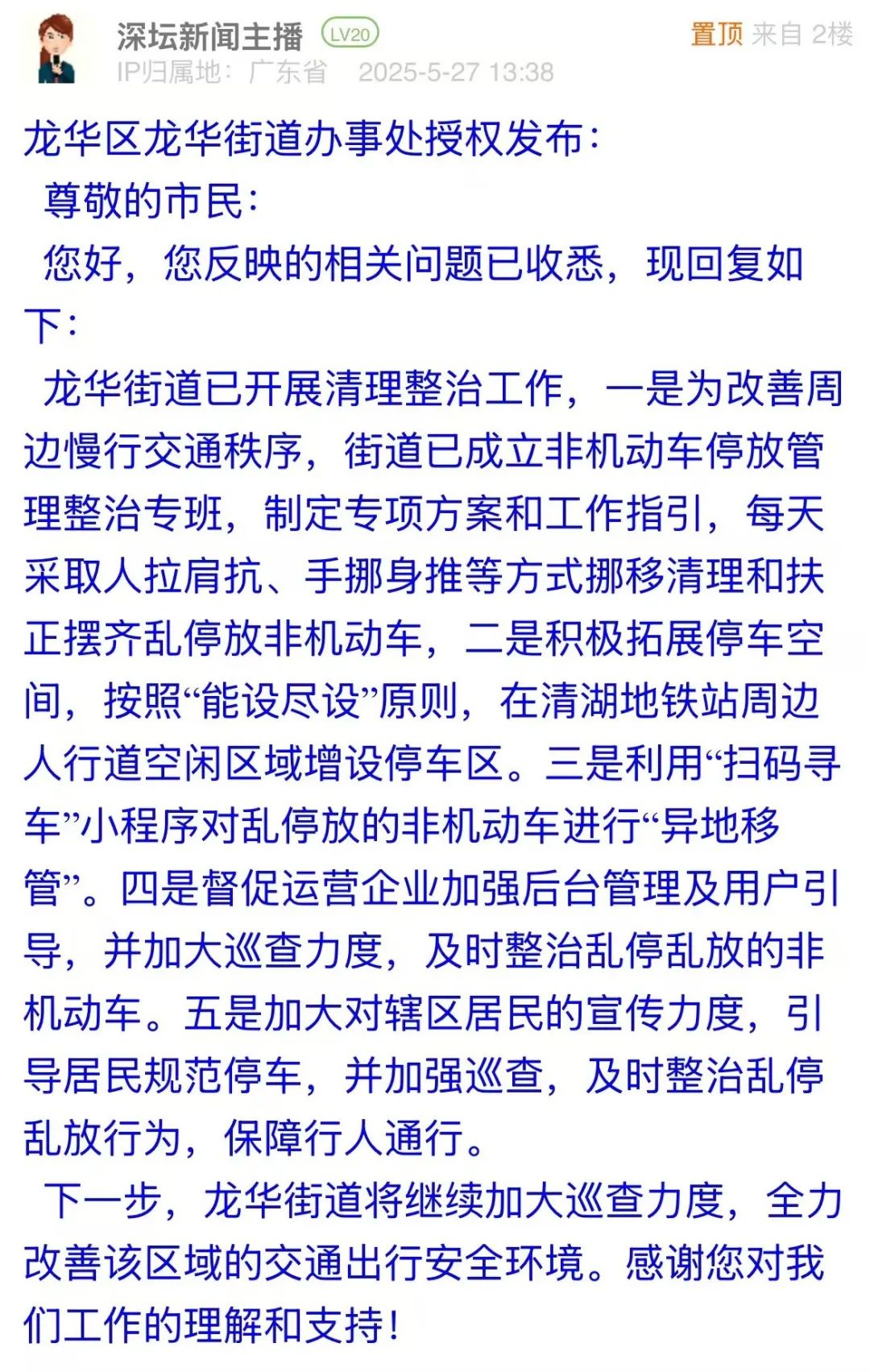 案例點(diǎn)評:地鐵口電動車與共享單車堆積,既阻礙行人通行,更影響區(qū)域交通秩序與城市形象。龍華街道辦接訴后迅速響應(yīng),成立專項整治專班,通過每日清理扶正、增設(shè)停車區(qū)、“掃碼尋車”移管、督促企業(yè)巡查及居民宣傳引導(dǎo)等多維度舉措,破解亂停難題,以“疏堵結(jié)合”的治理智慧,快速行動,綜合施策,為改善區(qū)域交通環(huán)境提供了務(wù)實(shí)范本。