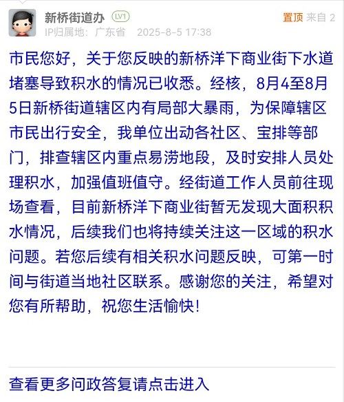 市民您好,關(guān)于您反映的新橋洋下商業(yè)街下水道堵塞導(dǎo)致積水的情況已收悉。經(jīng)核,8月4至8月5日新橋街道轄區(qū)內(nèi)有局部大暴雨,為保障轄區(qū)市民出行安全,我單位出動(dòng)各社區(qū)、寶排等部門,排查轄區(qū)內(nèi)重點(diǎn)易澇地段,及時(shí)安排人員處理積水,加強(qiáng)值班值守。經(jīng)街道工作人員前往現(xiàn)場(chǎng)查看,目前新橋洋下商業(yè)街暫無(wú)發(fā)現(xiàn)大面積積水情況,后續(xù)我們也將持續(xù)關(guān)注這一區(qū)域的積水問(wèn)題。若您后續(xù)有相關(guān)積水問(wèn)題反映,可第一時(shí)間與街道當(dāng)?shù)厣鐓^(qū)聯(lián)系。感謝您的關(guān)注,希望對(duì)您有所幫助,祝您生活愉快!