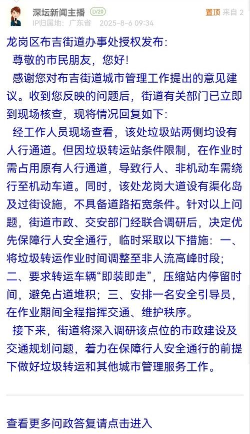 經(jīng)工作人員現(xiàn)場(chǎng)查看,該處垃圾站兩側(cè)均設(shè)有人行通道。但因垃圾轉(zhuǎn)運(yùn)站條件限制,在作業(yè)時(shí)需占用原有人行通道,導(dǎo)致行人、非機(jī)動(dòng)車需繞行至機(jī)動(dòng)車道。同時(shí),該處龍崗大道設(shè)有渠化島及過(guò)街設(shè)施,不具備道路拓寬條件。針對(duì)以上問(wèn)題,街道市政、交安部門經(jīng)聯(lián)合調(diào)研后,決定優(yōu)先保障行人安全通行,臨時(shí)采取以下措施:一、將垃圾轉(zhuǎn)運(yùn)作業(yè)時(shí)間調(diào)整至非人流高峰時(shí)段;二、要求轉(zhuǎn)運(yùn)車輛“即裝即走”,壓縮站內(nèi)停留時(shí)間,避免占道堆積;三、安排一名安全引導(dǎo)員,在作業(yè)期間全程指揮交通、維護(hù)秩序。