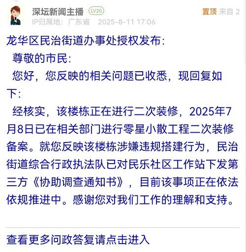 經(jīng)核實(shí),該樓棟正在進(jìn)行二次裝修,2025年7月8日已在相關(guān)部門進(jìn)行零星小散工程二次裝修備案。就您反映該樓棟涉嫌違規(guī)搭建行為,民治街道綜合行政執(zhí)法隊(duì)已對(duì)民樂(lè)社區(qū)工作站下發(fā)第三方《協(xié)助調(diào)查通知書》,目前該事項(xiàng)正在依法依規(guī)推進(jìn)中。感謝您對(duì)我們工作的理解和支持。