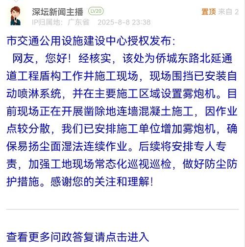 網(wǎng)友,您好!經(jīng)核實(shí),該處為僑城東路北延通道工程盾構(gòu)工作井施工現(xiàn)場(chǎng),現(xiàn)場(chǎng)圍擋已安裝自動(dòng)噴淋系統(tǒng),并在主要施工區(qū)域設(shè)置霧炮機(jī)。目前現(xiàn)場(chǎng)正在開展鑿除地連墻混凝土施工,因作業(yè)點(diǎn)較分散,我們已安排施工單位增加霧炮機(jī),確保易揚(yáng)塵面濕法連續(xù)作業(yè)。后續(xù)將安排專人專責(zé),加強(qiáng)工地現(xiàn)場(chǎng)常態(tài)化巡視巡檢,做好防塵防護(hù)措施。感謝您的關(guān)注和理解!