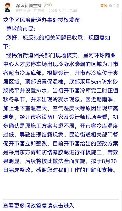 經(jīng)民治街道相關(guān)部門現(xiàn)場(chǎng)核實(shí),星河環(huán)球商業(yè)中心人才房停車場(chǎng)出現(xiàn)冷凝水滲漏的區(qū)域?yàn)殚_市客超市冷庫(kù)底部。根據(jù)設(shè)計(jì),開市客冷庫(kù)位于夾層區(qū)域,頂部設(shè)置保溫棉,底部采用5cm防水砂漿找平并設(shè)置排水。當(dāng)初開市客冷庫(kù)完工時(shí)正值秋冬季節(jié),并未出現(xiàn)冷凝水現(xiàn)象。因近期雨季,加上地下室溫差大、空氣濕度大等原因出現(xiàn)結(jié)露現(xiàn)象。經(jīng)開市客設(shè)備廠家及設(shè)計(jì)師現(xiàn)場(chǎng)查看,初步確認(rèn)是原施工方案考慮不周,開市客冷庫(kù)溫度過(guò)低,導(dǎo)致出現(xiàn)結(jié)露現(xiàn)象。民治街道相關(guān)部門督促開市客立即整改,目前開市客給出的整改方案是采用東方雨虹防結(jié)露膠泥進(jìn)行樣板施工,若效果明顯,后續(xù)將按此做法全面實(shí)施,擬于8月30日完成整改。感謝您對(duì)我們工作的理解和支持。