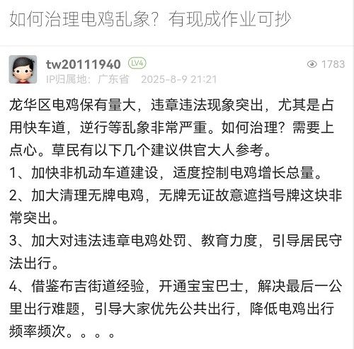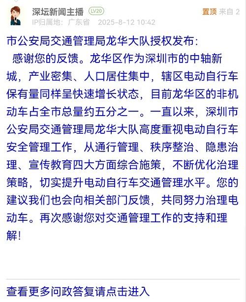 感謝您的反饋。龍華區(qū)作為深圳市的中軸新城,產(chǎn)業(yè)密集、人口居住集中,轄區(qū)電動(dòng)自行車保有量同樣呈快速增長(zhǎng)狀態(tài),目前龍華區(qū)的非機(jī)動(dòng)車占全市總量約五分之一。一直以來(lái),深圳市公安局交通管理局龍華大隊(duì)高度重視電動(dòng)自行車安全管理工作,從通行管理、秩序整治、隱患治理、宣傳教育四大方面綜合施策,不斷優(yōu)化治理策略,切實(shí)提升電動(dòng)自行車交通管理水平。您的建議我們也會(huì)向相關(guān)部門反饋,共同努力治理電動(dòng)車。再次感謝您對(duì)交通管理工作的支持和理解!