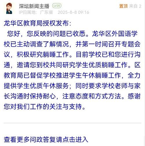 您好,您反映的問(wèn)題已收悉。龍華區(qū)外國(guó)語(yǔ)學(xué)校已主動(dòng)調(diào)查了解情況,并第一時(shí)間召開專題會(huì)議,積極研究躺睡工作。目前學(xué)校已和您進(jìn)行溝通,邀請(qǐng)您到校共同研究學(xué)生優(yōu)質(zhì)躺睡工作。區(qū)教育局已督促學(xué)校推進(jìn)學(xué)生午休躺睡工作,全力提供學(xué)生優(yōu)質(zhì)午休服務(wù);同時(shí)要求學(xué)校老師與家長(zhǎng)溝通時(shí)保持耐心,注意態(tài)度和方式方法。感謝您對(duì)我們工作的關(guān)注與支持。