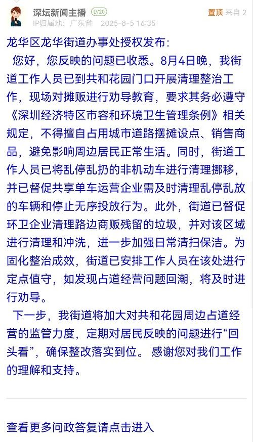 您好,您反映的問(wèn)題已收悉。8月4日晚,我街道工作人員已到共和花園門口開展清理整治工作,現(xiàn)場(chǎng)對(duì)攤販進(jìn)行勸導(dǎo)教育,要求其務(wù)必遵守《深圳經(jīng)濟(jì)特區(qū)市容和環(huán)境衛(wèi)生管理?xiàng)l例》相關(guān)規(guī)定,不得擅自占用城市道路擺攤設(shè)點(diǎn)、銷售商品,避免影響周邊居民正常生活。同時(shí),街道工作人員已將亂停亂扔的非機(jī)動(dòng)車進(jìn)行清理挪移,并已督促共享單車運(yùn)營(yíng)企業(yè)需及時(shí)清理亂停亂放的車輛和停止無(wú)序投放行為。此外,街道已督促環(huán)衛(wèi)企業(yè)清理路邊商販殘留的垃圾,并對(duì)該區(qū)域進(jìn)行清理和沖洗,進(jìn)一步加強(qiáng)日常清掃保潔。為固化整治成效,街道已安排工作人員在該處進(jìn)行定點(diǎn)值守,如發(fā)現(xiàn)占道經(jīng)營(yíng)問(wèn)題回潮,將及時(shí)進(jìn)行勸導(dǎo)。