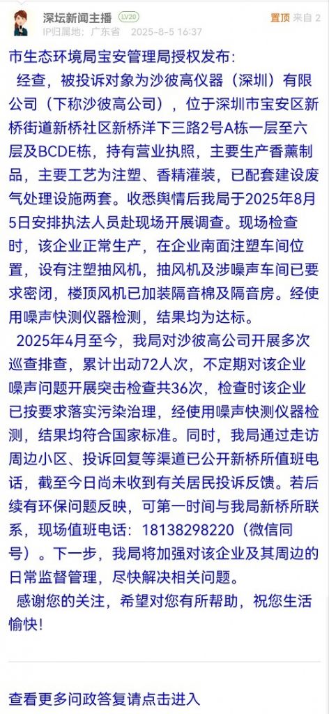 經(jīng)查,被投訴對(duì)象為沙彼高儀器(深圳)有限公司(下稱沙彼高公司),位于深圳市寶安區(qū)新橋街道新橋社區(qū)新橋洋下三路2號(hào)A棟一層至六層及BCDE棟,持有營(yíng)業(yè)執(zhí)照,主要生產(chǎn)香薰制品,主要工藝為注塑、香精灌裝,已配套建設(shè)廢氣處理設(shè)施兩套。收悉輿情后我局于2025年8月5日安排執(zhí)法人員赴現(xiàn)場(chǎng)開展調(diào)查?,F(xiàn)場(chǎng)檢查時(shí),該企業(yè)正常生產(chǎn),在企業(yè)南面注塑車間位置,設(shè)有注塑抽風(fēng)機(jī),抽風(fēng)機(jī)及涉噪聲車間已要求密閉,樓頂風(fēng)機(jī)已加裝隔音棉及隔音房。經(jīng)使用噪聲快測(cè)儀器檢測(cè),結(jié)果均為達(dá)標(biāo)。