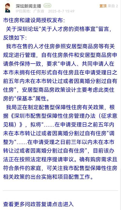 關(guān)于深圳論壇“關(guān)于人才房的資格事宜”留言,反饋如下: