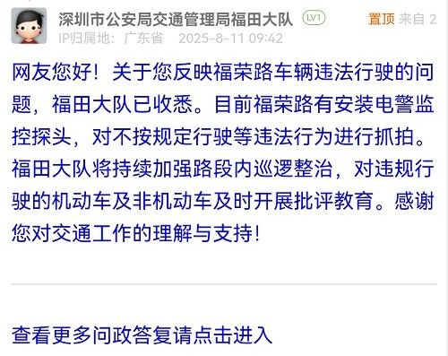 網(wǎng)友您好!關(guān)于您反映福榮路車輛違法行駛的問(wèn)題,福田大隊(duì)已收悉。目前福榮路有安裝電警監(jiān)控探頭,對(duì)不按規(guī)定行駛等違法行為進(jìn)行抓拍。福田大隊(duì)將持續(xù)加強(qiáng)路段內(nèi)巡邏整治,對(duì)違規(guī)行駛的機(jī)動(dòng)車及非機(jī)動(dòng)車及時(shí)開展批評(píng)教育。感謝您對(duì)交通工作的理解與支持!