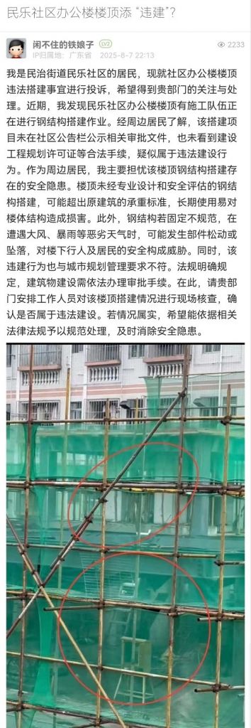 19. 帖文《民樂(lè)社區(qū)辦公樓樓頂添 “違建”?》