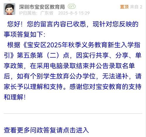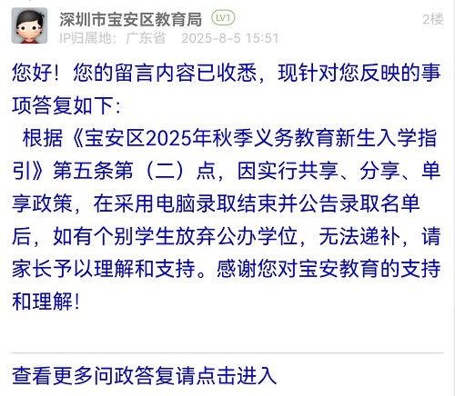 根據(jù)《寶安區(qū)2025年秋季義務(wù)教育新生入學(xué)指引》第五條第(二)點(diǎn),因?qū)嵭泄蚕?、分享、單享政策,在采用電腦錄取結(jié)束并公告錄取名單后,如有個(gè)別學(xué)生放棄公辦學(xué)位,無(wú)法遞補(bǔ),請(qǐng)家長(zhǎng)予以理解和支持。感謝您對(duì)寶安教育的支持和理解!